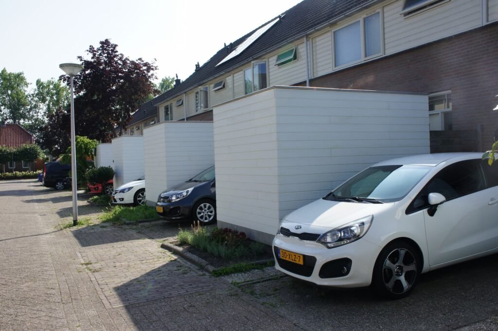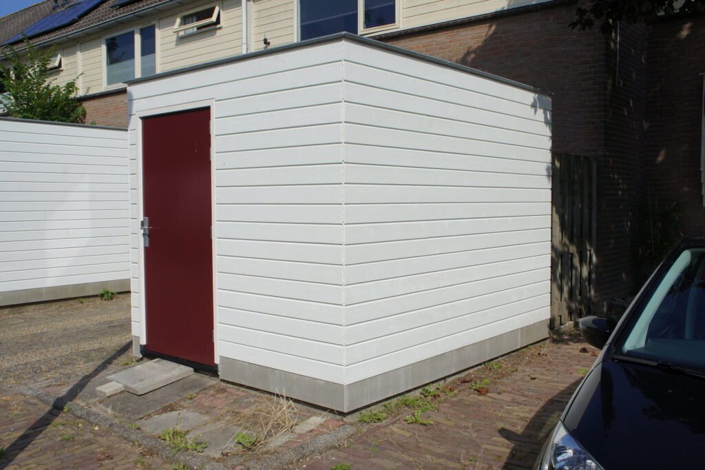 De schuren zijn functioneel en strak ontworpen, passend bij de woonomgeving. Voor de afwerking is gebruikgemaakt van het duurzame materiaal CapeCod, dat bekendstaat om zijn natuurlijke uitstraling en onderhoudsvriendelijkheid. Dit zorgt ervoor dat de schuren lang mooi blijven en weinig onderhoud vereisen.